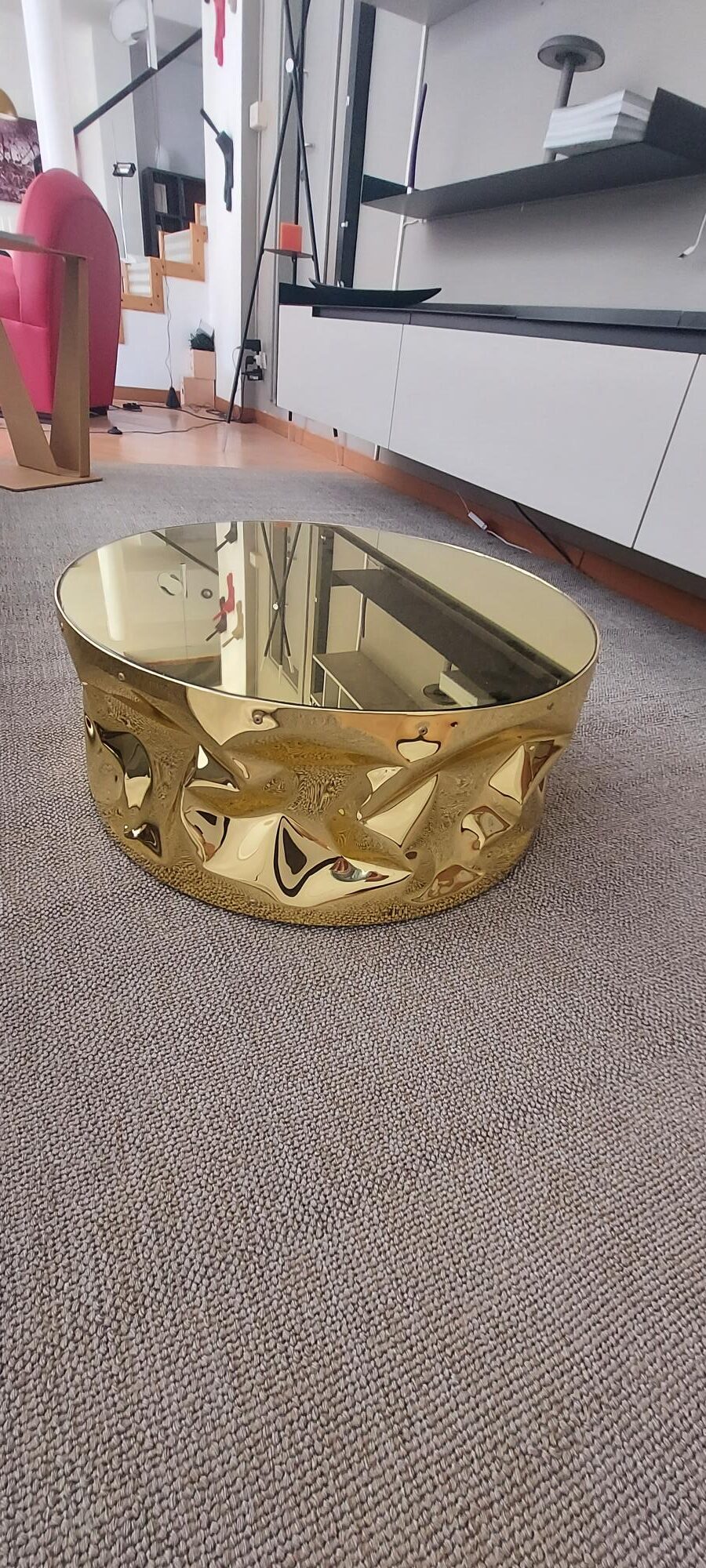 Tab.ulino tavolino su ruote arricchito da piano in cristallo a specchio che amplifica i bagliori provenienti dalla struttura in oro. Assolutamente a loro agio nei contesti più contemporanei ma capaci anche di regalare quel tocco di ricercatezza agli ambienti più convenzionali.
